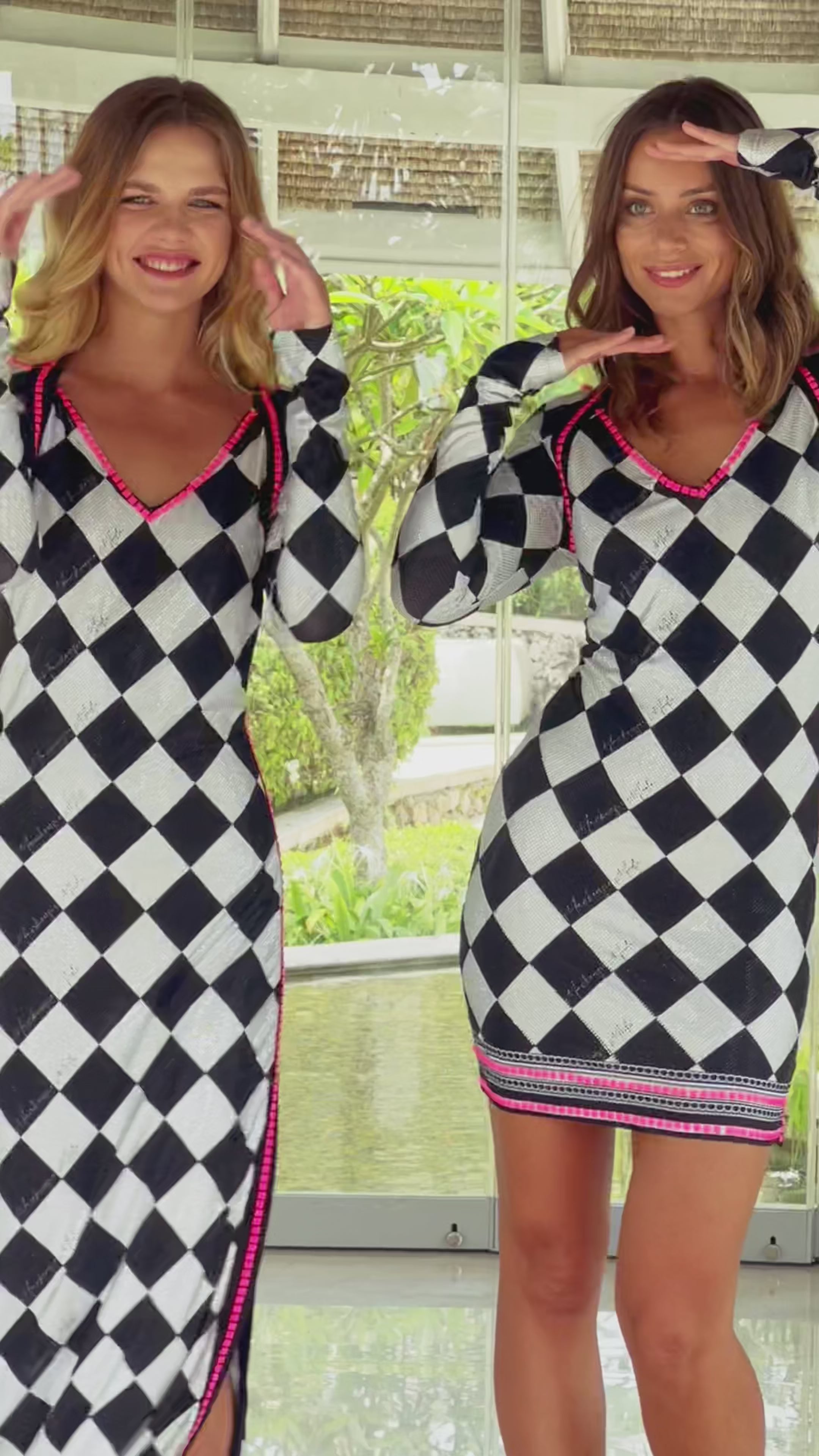 Introducing the stunning "The Diamonds Are Mine Maxi" dress. This elegant gown is adorned with Swarovski crystals, adding a touch of luxury and glamour. The dress features a monochrome diamond print in classic black and white, creating a timeless and sophisticated look.